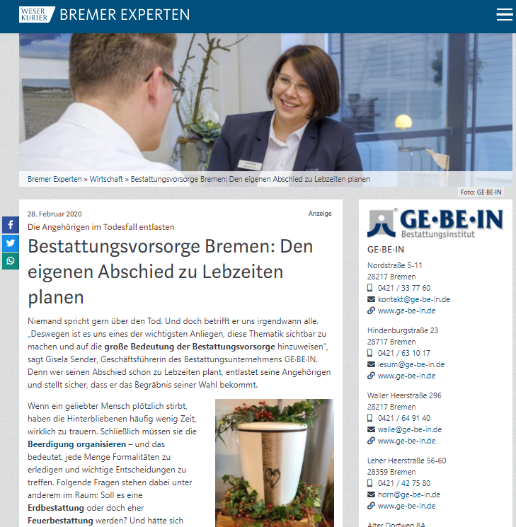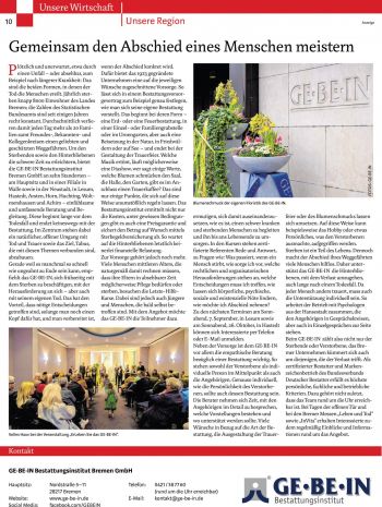 Am 28.06. erschien die Sonderveröffentlichung "Unsere Wirtschaft - Unsere Region". Darin wurde unter anderem über die historische und neuere Entwicklung sowie die heutige Bedeutung der GE·BE·IN Bestattungsinstitut Bremen GmbH für Bremen berichtet. Vielen Dank an den Weser-Kurier für diesen tollen Artikel.