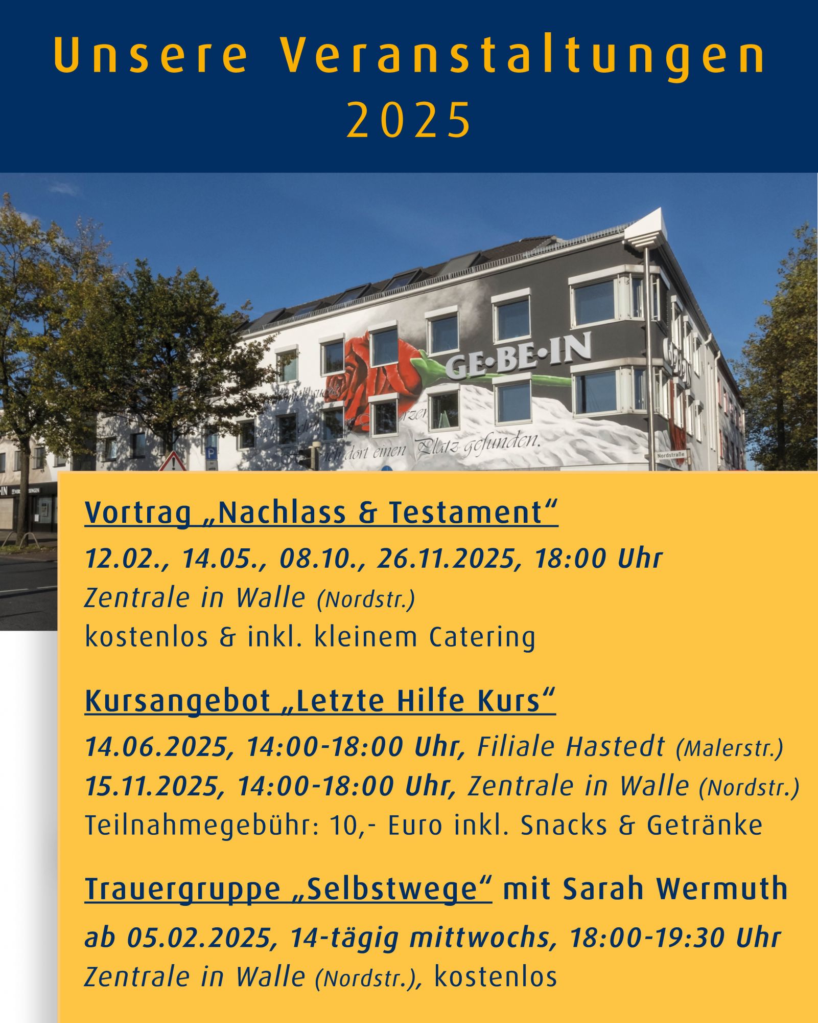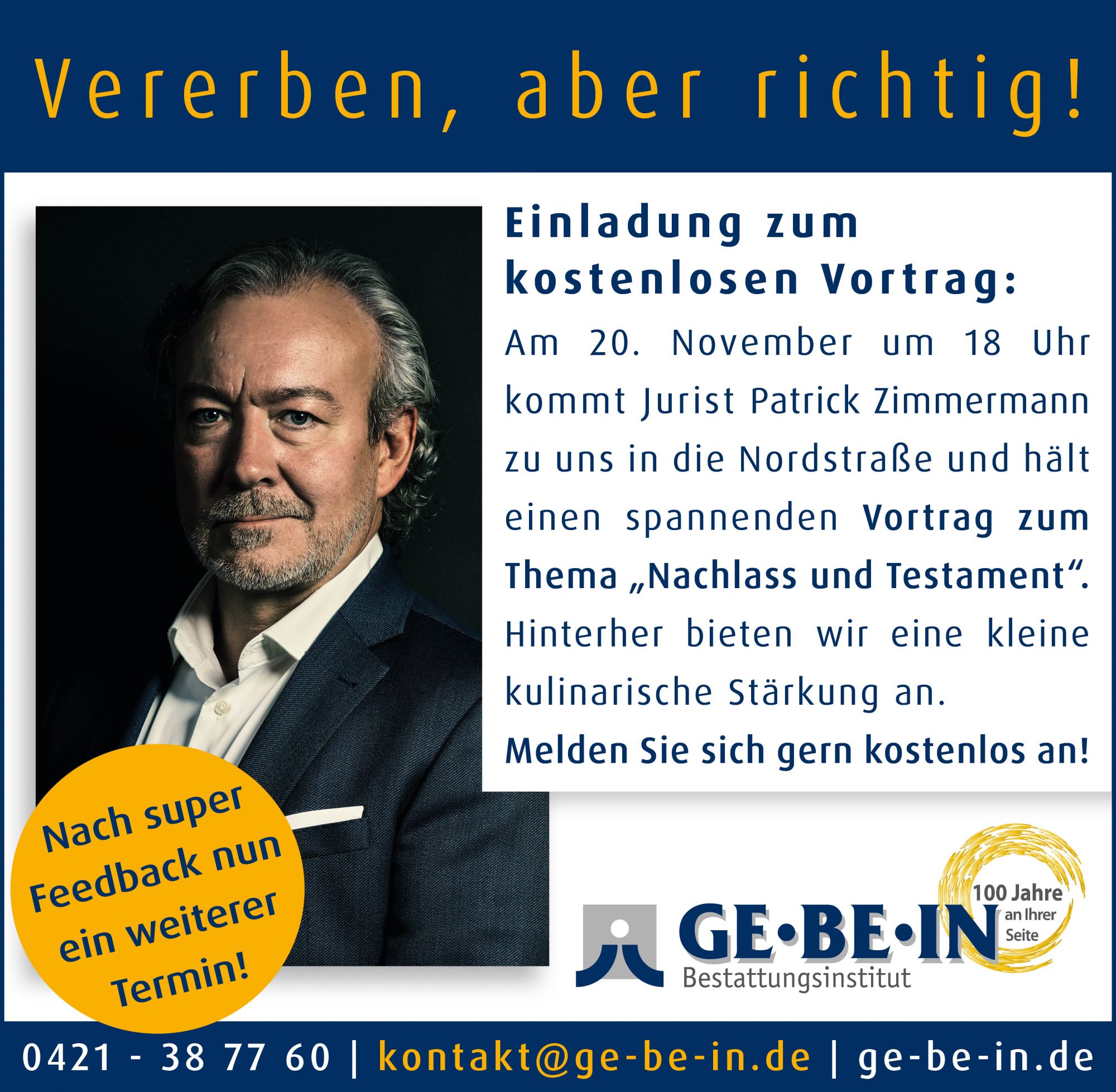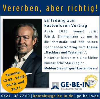 An diesem Termin werden Fragen geklärt, wie z.B. "Was kann ich vor meinem Tod schon regeln und worüber sollte ich nachdenken?" und "Mit wem sollte ich über die Details sprechen?". Der Vortrag wird von Herwig Gründel, dem Abteilungsleiter Beratung des GE·BE·IN Bestattungsinstitutes gehalten. Veranstaltungsort ist die Stadtteilfiliale der Sparkasse Bremen in Horn-Lehe (Gerold-Janssen-Straße 5-7 in 28359 Bremen). Der Eintritt ist frei.